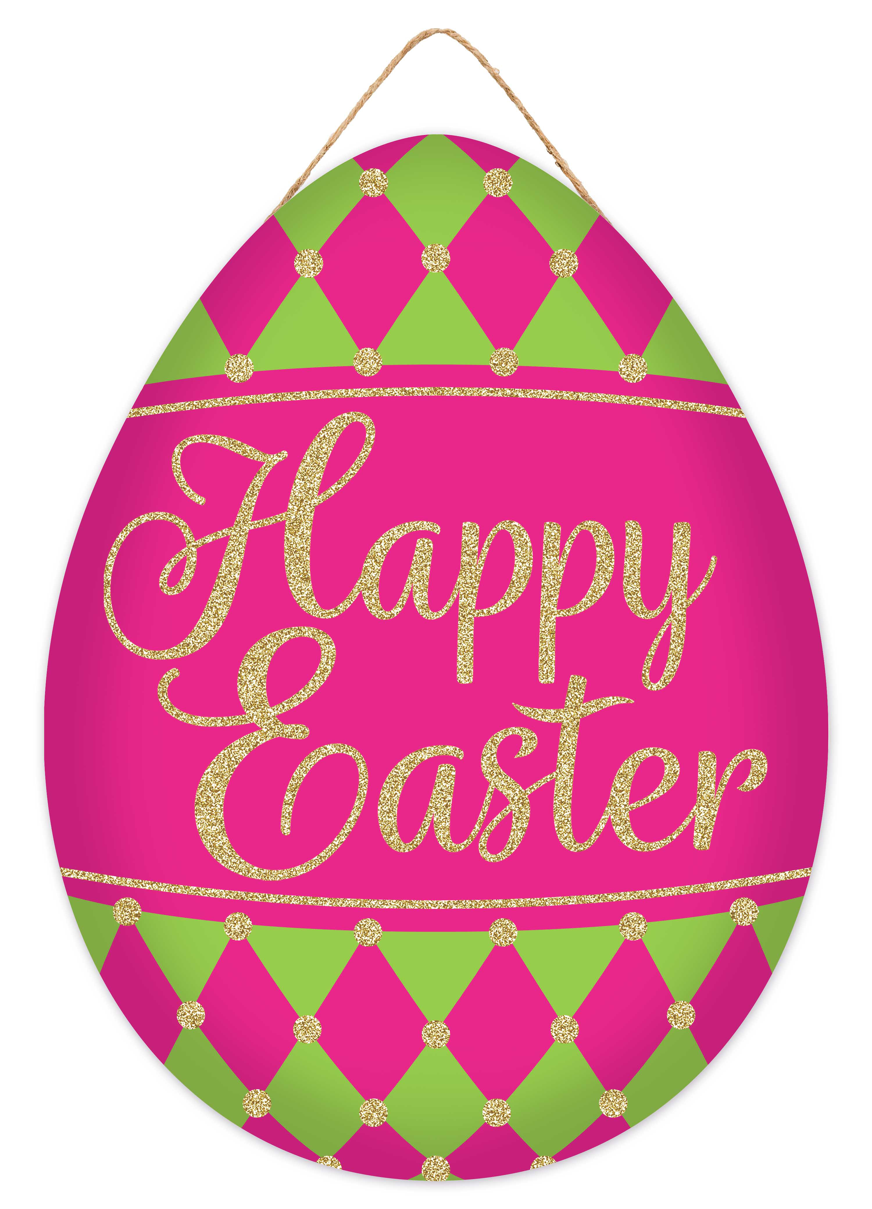 12"H x 9"L x 6mm Thick Mdf Glitter Happy Easter W/Harlequin Pattern Egg Shape Sign W/Jute Hanger