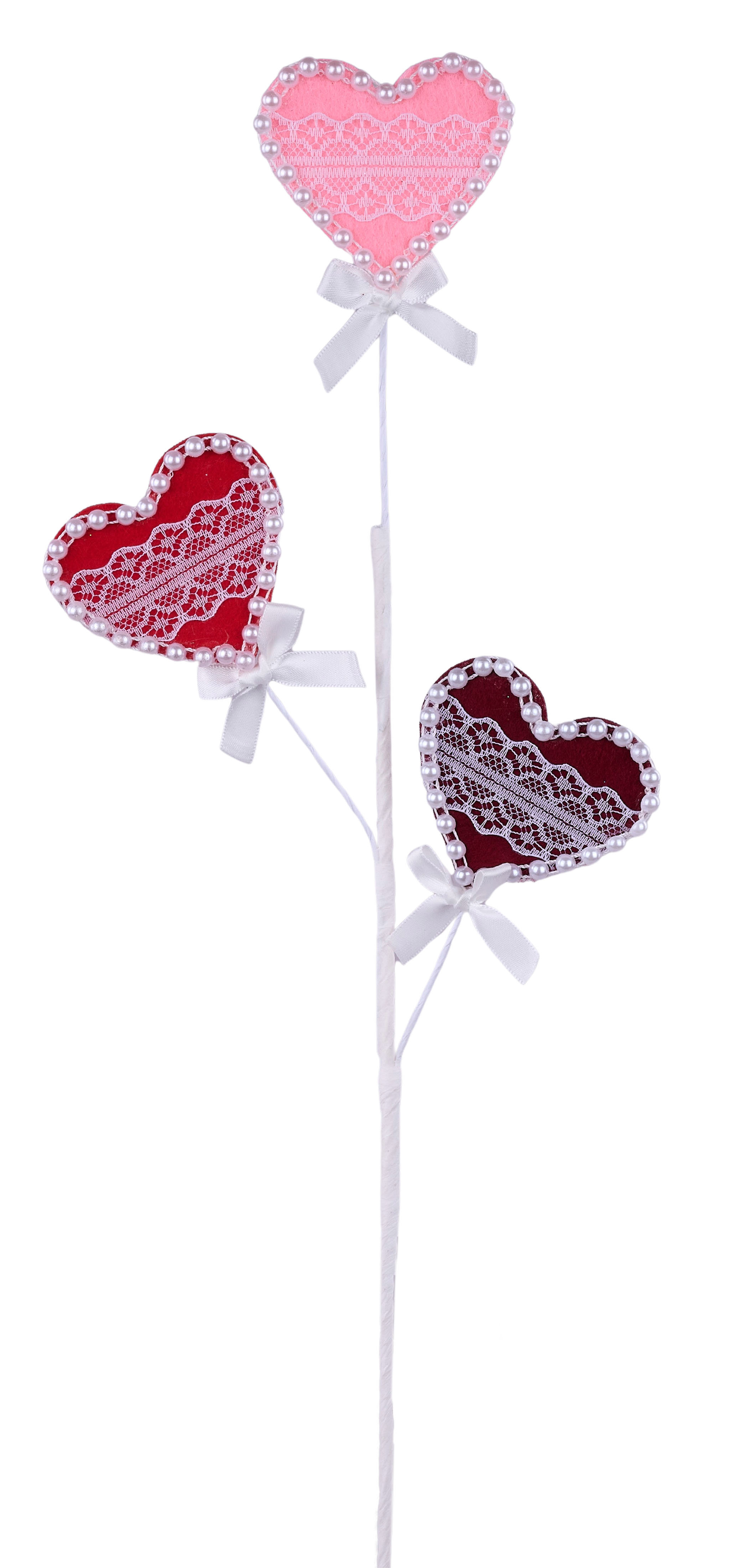 This Romantic 23"H Lace/Pearl/Felt Fabric Heart Spray Features Three Beautifully Crafted Hearts, Each Measuring 2.75"L x 2.48"H. The Hearts Are A Lovely Combination Of Delicate Lace, Luminous Pearls, And Soft Felt Fabric, Creating A Rich Textural Display. The Entire Spray Is Elegantly Finished With White Tape Wrapping The Stems, Making It Perfect For Adding A Touch Of Charm To Floral Arrangements, Wreaths, Or Valentine's Day Decor.
