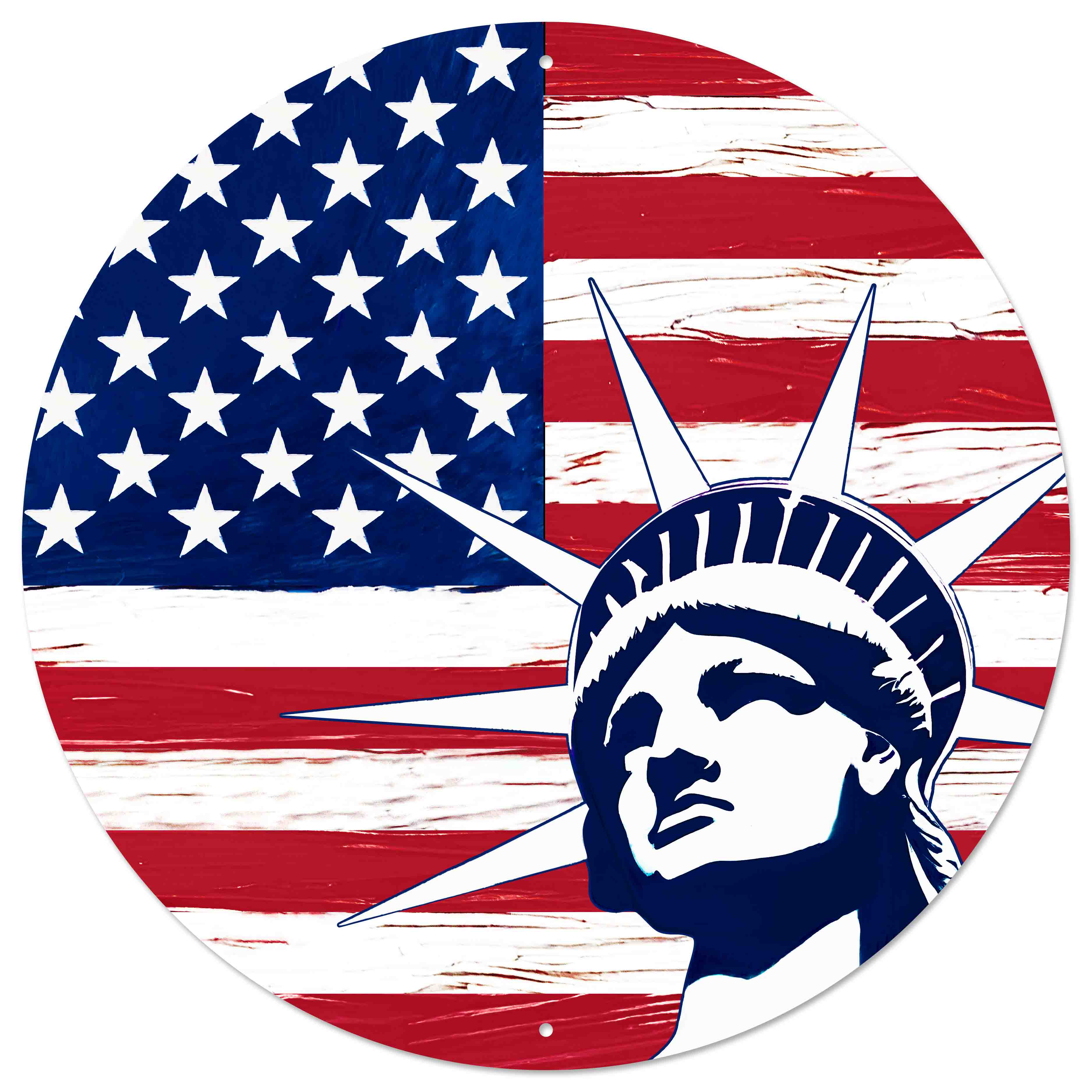 This Striking 12" Diameter Metal Sign Features An Abstract Patriotic Design Of The Statue Of Liberty. It's Crafted From Durable Metal, Making It A Lasting Piece For Indoor Or Outdoor Display. The Sign Includes Holes At The Top And Bottom For Easy Hanging, So You Can Proudly Showcase Your Patriotism.