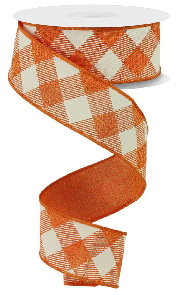 Add This Versatile Diagonal Check On Royal Burlap Ribbon To Any Display You See Fit! This Ribbon Features A Wired Edge, Along With An Orange And Ivory Diagonal Check Pattern, Making It An Adaptable Addition To Any Decorative Piece Of Your Choosing.