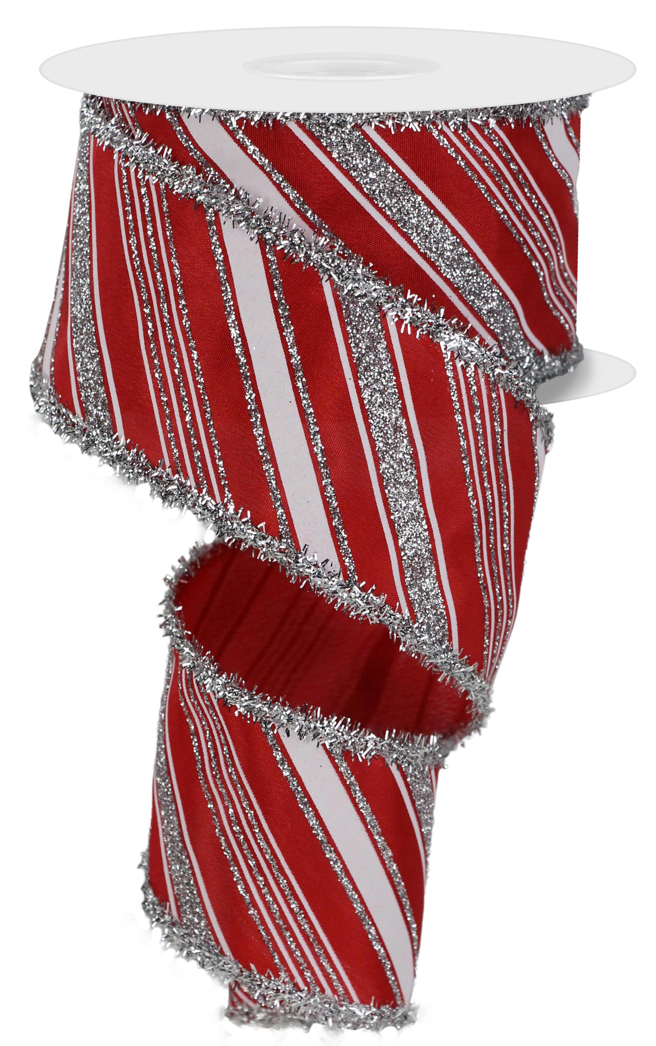 Add This Versatile Diagonal Line/Satin/Tinsel Ribbon To Any Display You See Fit! It's Tinsel Wired Edge And Mix Of Different Silver And White Lines Against A Red Base Make It An Adaptable Addition To Any Decorative Piece Of Your Choosing.