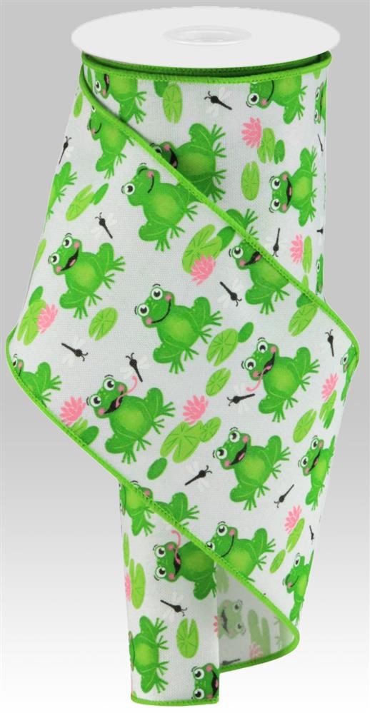 Hop Right Into Seasonal Decorating When You Use This Frogs On Faux Royal Burlap Ribbon! Featuring A Sewn Wired Edge, This Ribbon Has A Variety Of Charming Frogs, Joined By Lily Pads, Flowers And Dragonflies On A White Base. Add This Ribbon To A Wreath, Paired With A Decorative Sign, Colorful Mesh, Or Fun Sprays And Picks!