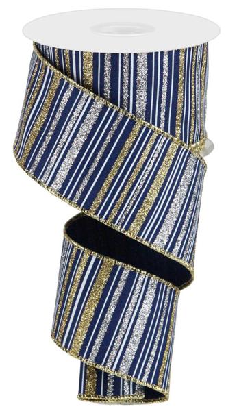 Add This Impactful Glitter Stripe On Diagonal Weave Ribbon To Any Display You See Fit! Featuring A Wired Edge, Along With An Arrangement Of Glittery Gold And Silver Stripes Atop A Navy Blue Base, This Ribbon Will Look Marvelous When Used In Any Context! Consider Adding It To A Wreath Display, Along With Mesh, Fun Sprays, And Picks!