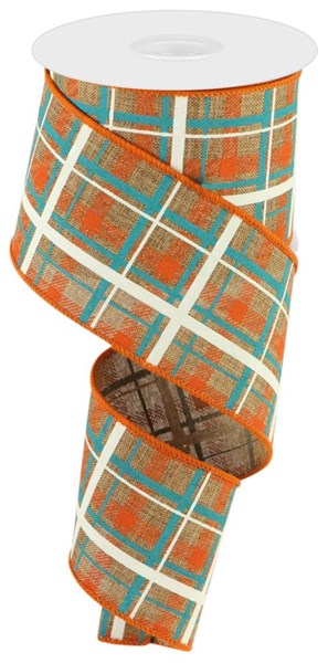 Add This Versatile Printed Plaid/Royal Burlap Ribbon To Any Display You See Fit! This Ribbon Features A Wired Edge, Along With A Tan, Dark Orange, Turquoise And Light Natural Plaid Pattern, Making It An Adaptable Addition To Any Decorative Piece Of Your Choosing.