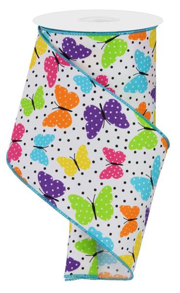 Celebrate The Delicate Butterfly By Outfitting Your Decor With This Butterflies/Dots On Diagonal Ribbon! Featuring A Wired Edge, Along With An Assortment Of Bright Multi-Colored Butterflies, With A Polka-Dot Background, This Ribbon Is The Perfect Addition To Your Next Seasonal Display! Use This Ribbon In A Wreath, Outfitted With Colorful Mesh, Or A Complementary Sign!
