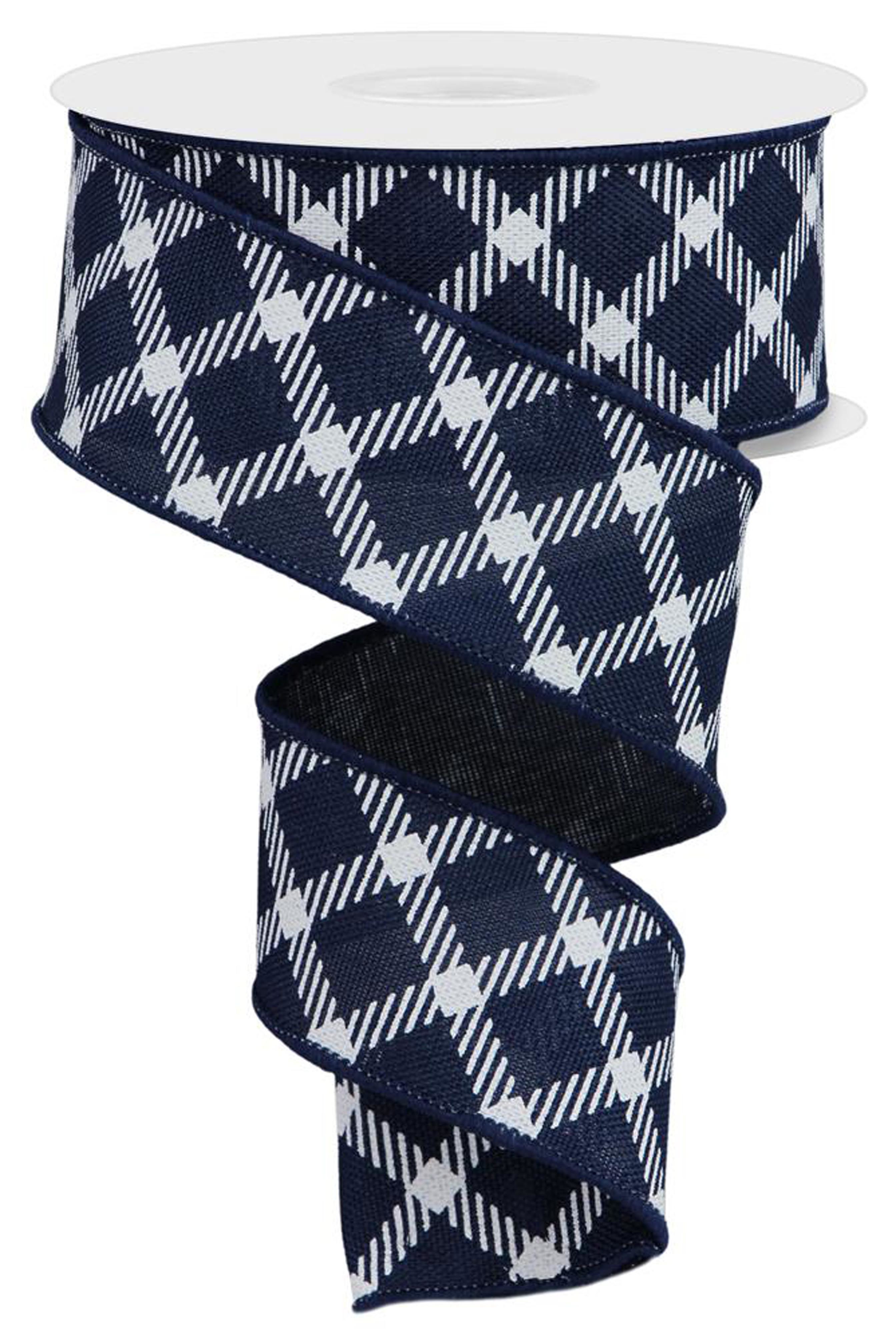 Add This Versatile Diamond Check/Faux Royal Burlap Ribbon To Any Display You See Fit! This Ribbon Features A Wired Edge, Along With A Navy Blue And White Diamond Check Pattern, Making It An Adaptable Addition To Any Decorative Piece Of Your Choosing.